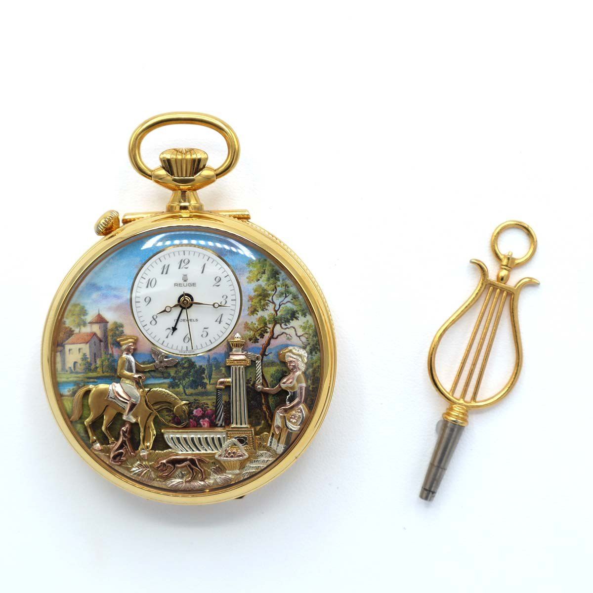 | 商品の特徴 | 懐中時計 稼働 リュージュ オルゴール 手巻き からくり アンティーク。懐中時計 稼働 リュージュ オルゴール 手巻き からくり アンティーク。2025年最新】リュージ 懐中時計の人気アイテム - メルカリ。懐中時計 稼働 リュージュ オルゴール 手巻き からくり アンティーク。お値下げしましたセットでの販売を希望しますこれ以上のお値下げはありませんのでお値下げ依頼はすみませんがご遠慮願います親族から譲り受けたスイスリュージュ社のオルゴール付き手巻き懐中時計です子供が狙っているため壊される前に手放すことにしましたアクセサリー掛けとセットでお願いしますオルゴール、時計とも稼動します蓋を開けると「エリーゼのために」のメロディが流れ、閉じると止まる仕様です(時計とは連動していません)オルゴールについてはゼンマイの残量が少なかったり、気温差などでたまに蓋を開けても曲が鳴らないことがあります そのような時はゼンマイを少し巻くかストッパーに手を触れると動き出します オルゴール動作中に「ジー音」が少し出ますが構造上の稼動音のため不具合ではありません時計本体 カン含む縦約7cm 、幅約4.7cm 厚さ約1.9cm チェーン約36cm (オリジナルなのかは不明) 1日巻き 普通のアナログ時計の巻き方とほぼ 同様です 書類等画像以外に付属品はありま せんフランス製ヴィンテージ懐中時計掛け 高さ約16cm、奥行約7cm、幅約11.5cm(リュージュブランドではありません) 脚は固定されていて閉じませんが懐中時計以外でもカメオやペンダントなどお気に入りの品を飾ってもステキだと思いますとても稀少な品です是非ご検討くださいませどうぞよろしくお願いします画像3、4、5に写っている白の丸いものは品物の押さえに使った芳香剤で専用ケースではありません付属はしませんのでご了承ください美しい絵画と精緻な彫刻が特徴の手巻き懐中時計- デザイン: 美しい絵画が施された懐中時計- 装飾: 精緻な彫刻が施された金色のケース- ムーブメント: 手巻き式の機械式ムーブメント- 文字盤: 小さなアナログ文字盤- チェーン: 金色のチェーン付きピアノを弾く少女 ご覧いただきありがとうございますREUGE MUSICリュージュオルゴール | ||